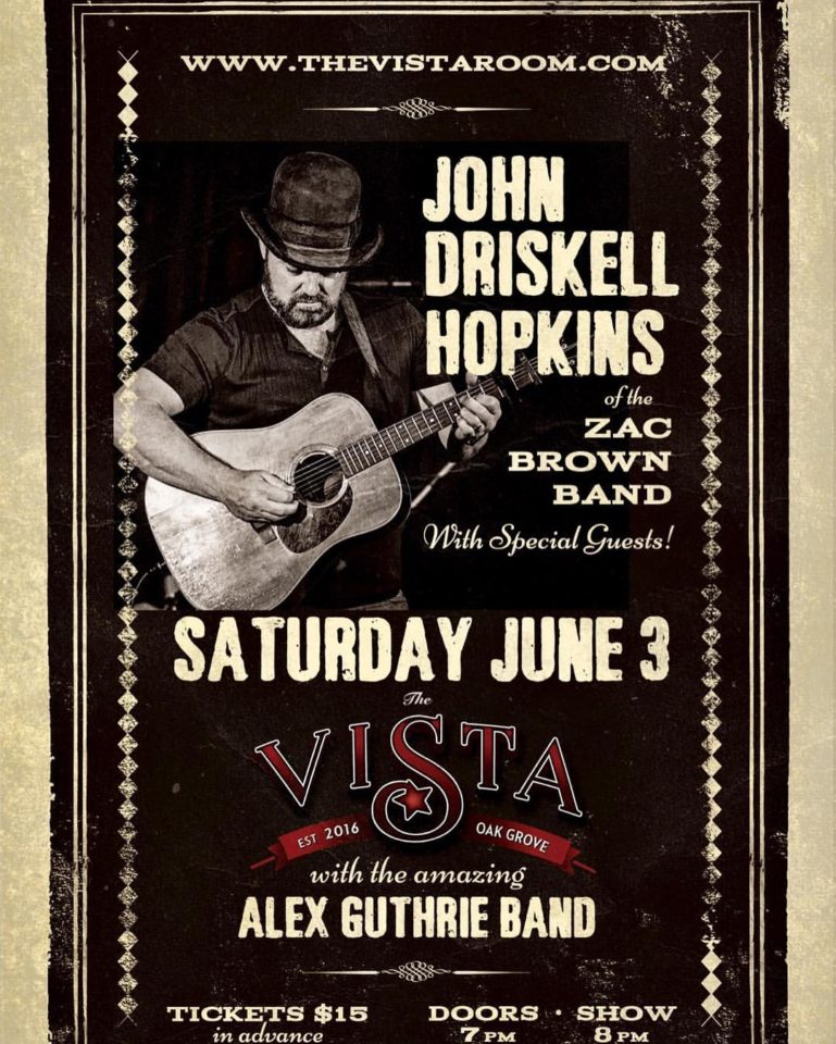 Join us for a special show featuring multi-instrumentalist, singer/songwriter John Driskell Hopkins of The Zac Brown Band! Along with very special guests, including The Alex Guthrie band! Doors at 7 pm show starts at 8 pm! Tickets only $15 adv. / $20 Day of (Tables Avail.)